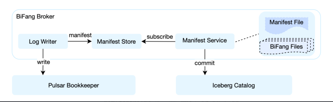 Manifest Service 是 BiFang 的核心模块,作为 Pulsar 流数据与 Iceberg 元数据之间的桥梁,实现增量数据处理、文件组织、快照提交及实时查询等关键功能。