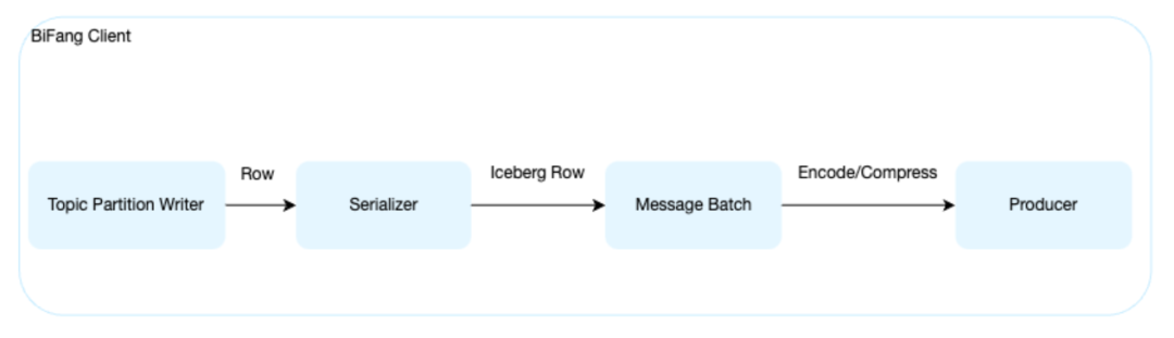 在传统 Pulsar 客户端中,写入只关心 Topic Partition;而在 BiFang 中,客户端需要增强,以便与 Iceberg 表的语义对齐。这样客户端写入行为从写 “MQ 消息” 提升为写 “Iceberg 表的分区数据”,流和湖在入口层面就统一。