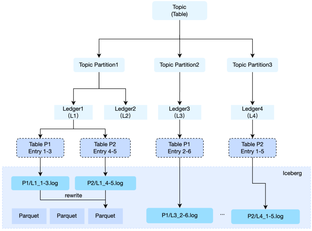 4. 生成的逻辑文件即 Iceberg 的 DataFile,记录数据量、文件大小、分区、LedgerId、Entry 范围等元信息。
