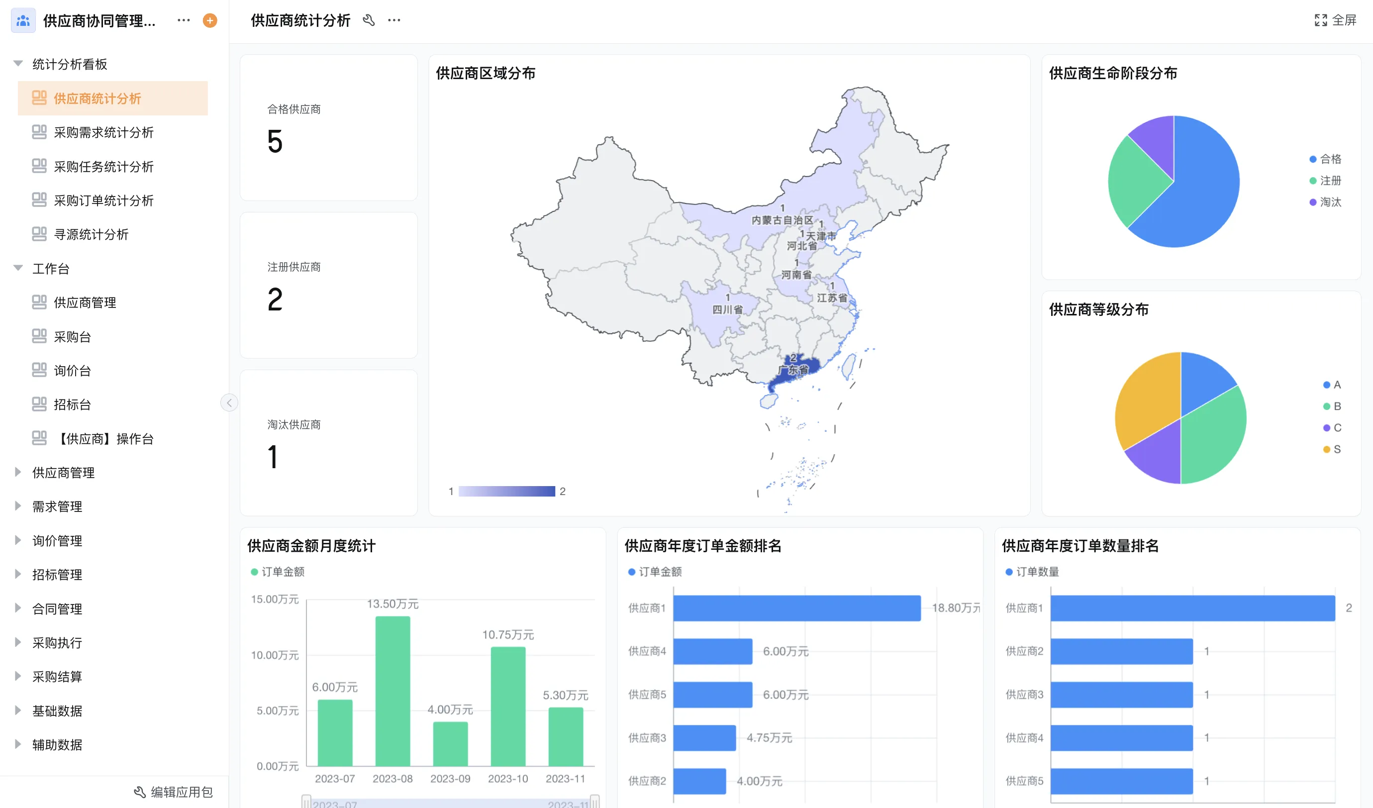 无代码能力 | 国内首批通过中国信通院无代码平台通用能力测评(61项通过55项),并通过华为鲲鹏、麒麟软件、统信UOS等国产系统认证;拥有6大核心引擎,从部门级表单到集团级业务系统全场景覆盖 | 提供丰富的表单与流程模板,支持可视化搭建采购流程 | 具备较强的自定义能力,可灵活配置采购管理模块 |
