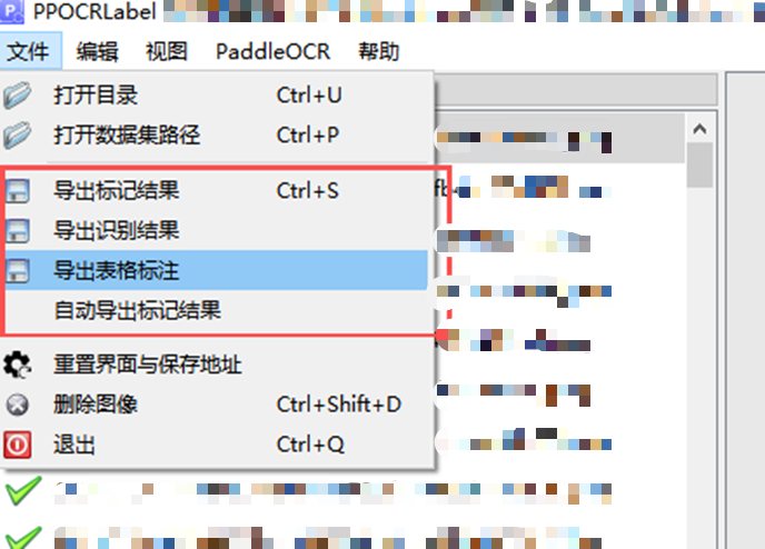 所有图片标注完成后,或者标注过程需要中断,导出相关文件。如果无需进行文字识别模型微调的就不用导出识别结果,其余的都要把下图红框内的选项都点一遍。