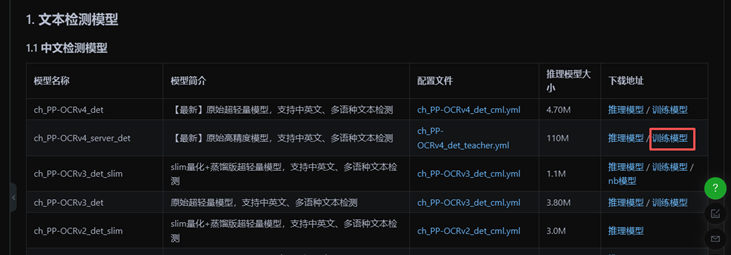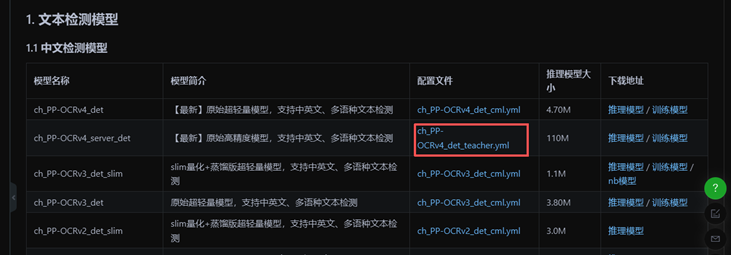 Global.pretrained_model | 预训练模型,如果想对自己的模型进行二次训练,则修改为本地已经训练好的best_accuracy.pdparams的地址。注意路径为best_accuracy.pdparams文件的路径,但不用加pdparams后缀,如"./Preliminary_training/ch_PP-OCRv4_det_teacher/best_accuracy" |
