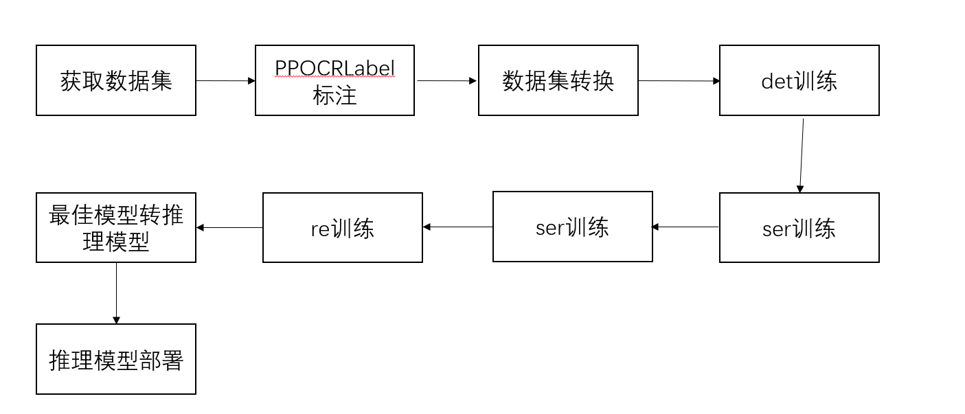 完成关键信息抽取,至少需要2个步骤:首先使用OCR模型,完成文字位置与内容的提取(det+rec),然后使用kie模型,根据图像、文字位置以及文字内容,提取出其中的关键信息。常见的训练方法有两种:(1)直接使用ser来分类,即det+rec+ser;(2)联合ser+re找键值对,即det+rec+ser+re。