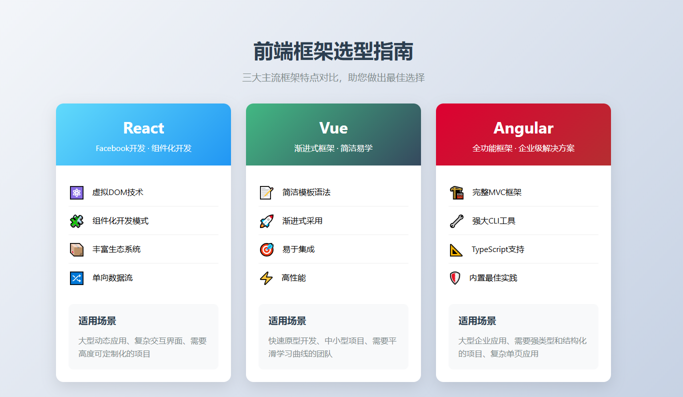 Angular 提供全功能解决方案但学习曲线较陡。