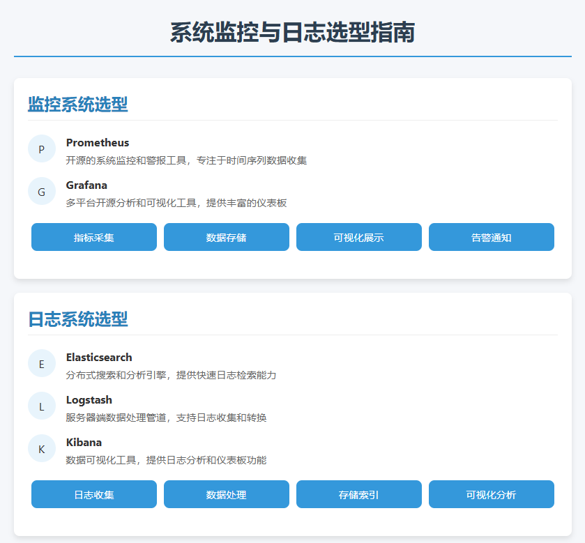 监控与日志系统保障服务稳定性。可以考虑使用Prometheus 收集系统指标数据,Grafana 提供可视化仪表板;采用ELK Stack(Elasticsearch、Logstash、Kibana)集中管理应用日志,便于故障排查。