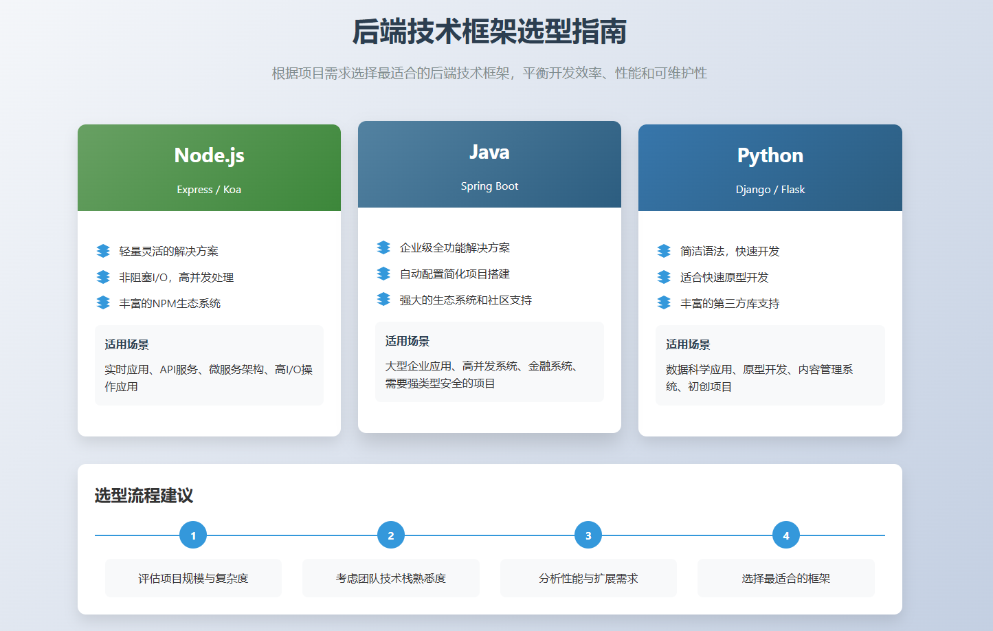 框架选型需评估团队熟悉的技术、其社区活跃度、文档完整性和扩展性,避免采用过于小众的技术。造成许多不可预知的风险