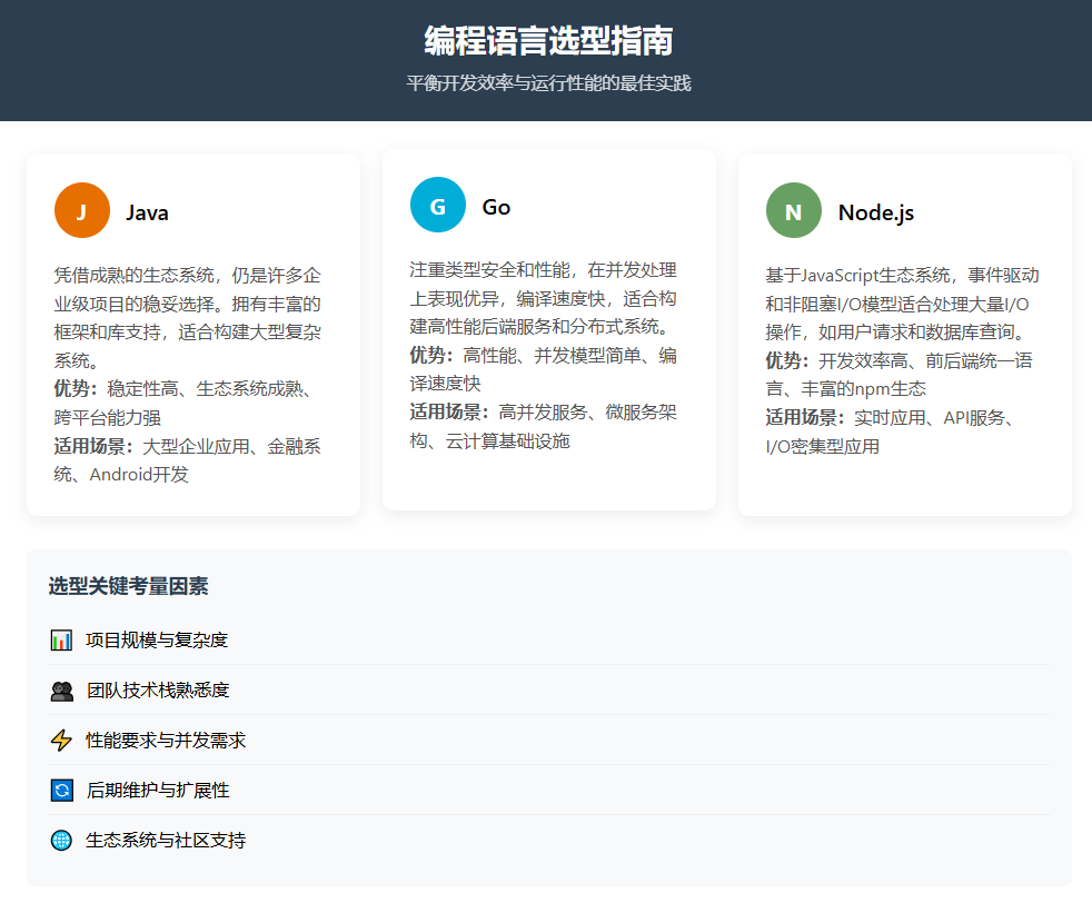 当然如果团队熟悉 JavaScript 生态,Node.js 凭借事件驱动和非阻塞 I/O 模型适合处理大量 I/O 操作,如大量用户请求和数据库查询。
