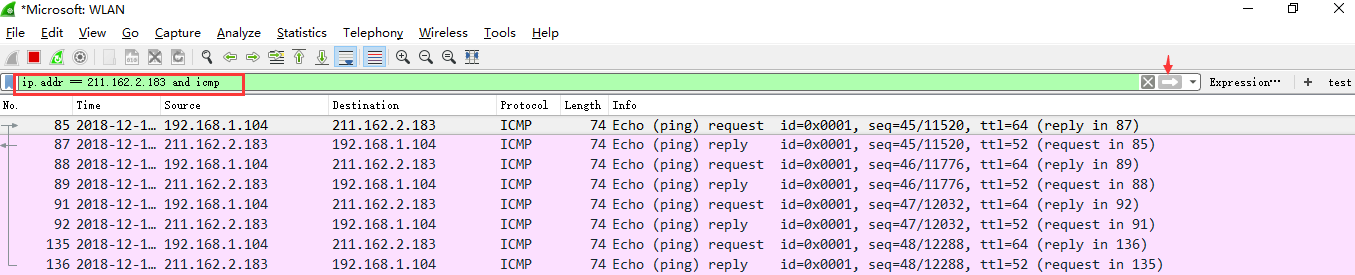 观察上述获取的数据包列表,含有大量的无效数据。这时可以通过设置显示器过滤条件进行提取分析信息。ip.addr == 211.162.2.183 and icmp。并进行过滤。