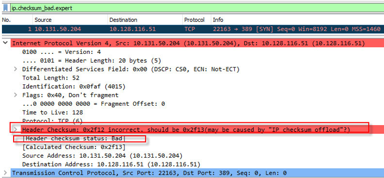 ip.checksum_bad.expert当 IP 校验和被卸载时,可以在 Wireshark 中看到相同的警告,这意味着数据包没有损坏。