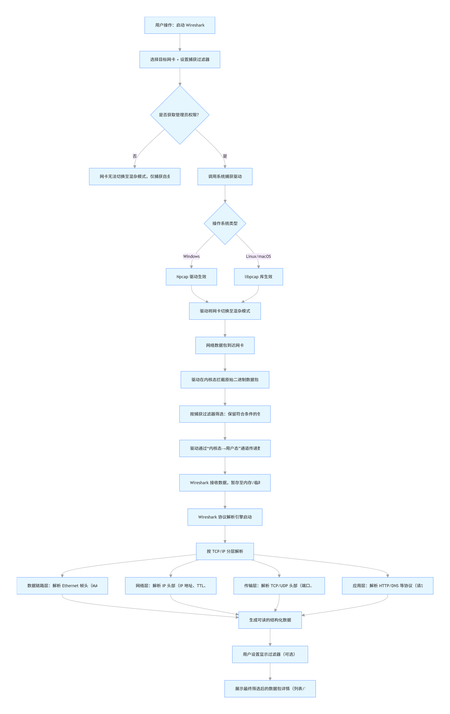 权限与驱动是前提:管理员权限决定能否开启混杂模式(捕获局域网所有流量),不同系统依赖专属驱动(Npcap/libpcap)实现底层数据拦截;