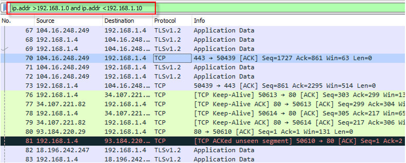 ip.addr >192.168.1.0 and ip.addr <192.168.1.10