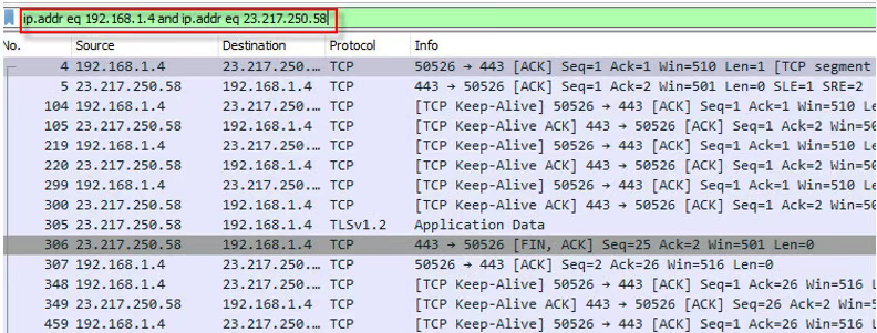 ip.addr eq 192.168.1.4 and ip.addr eq 23.217.250.58