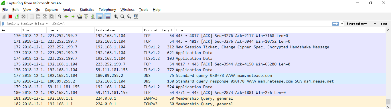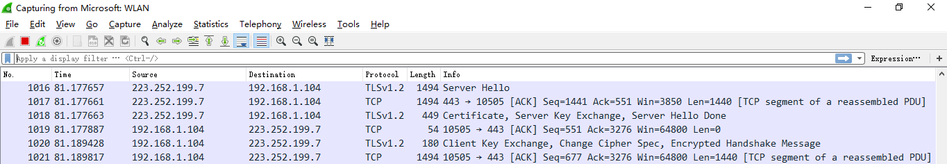 显示过滤器是用于在抓取数据包后设置过滤条件进行过滤数据包。通常是在抓取数据包时设置条件相对宽泛,抓取的数据包内容较多时使用显示过滤器设置条件顾虑以方便分析。同样上述场景,在捕获时未设置捕获规则直接通过网卡进行抓取所有数据包,如下