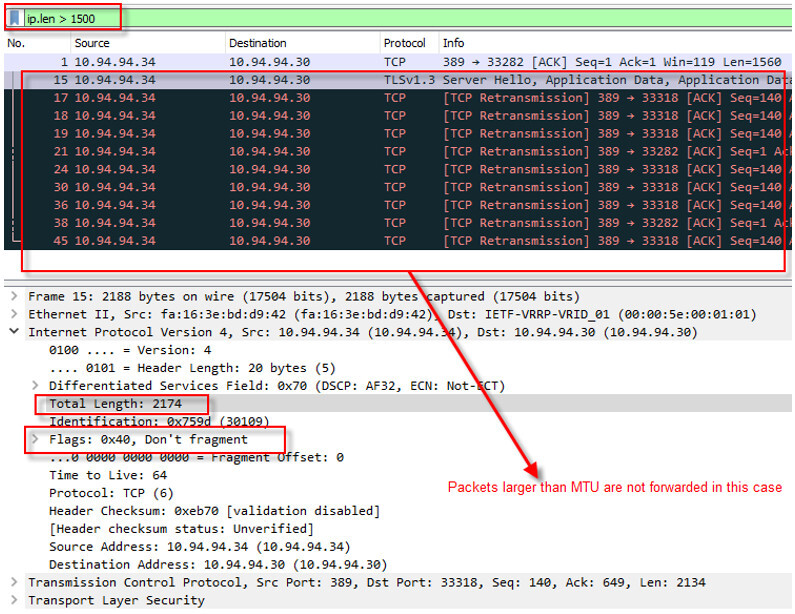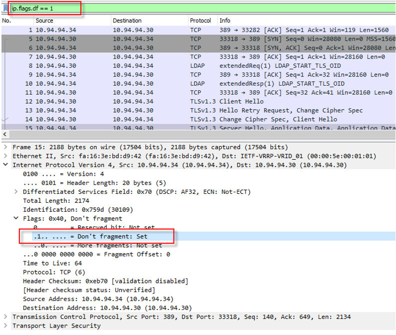 某些应用程序不希望其数据包在网络中被碎片化。当路径上的设备(路由器、防火墙、交换机等)收到这些数据包时,它们会检查这些数据包是否大于 MTU 大小,如果是,设备会丢弃这些数据包,从而导致故障。可以使用以下过滤器。