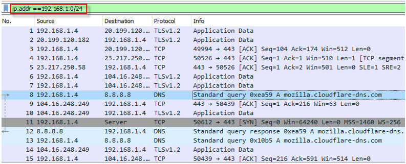 Wireshark 允许您指定网络及其子网长度。当我们想要查看进出网络的数据包时,我们需要该过滤器。