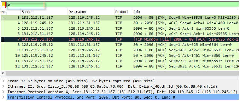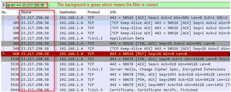 ip.src==23.217.250.58每当我们在过滤命令框中输入任何命令时,如果命令正确,它就会变成绿色。否则,它会变成红色。