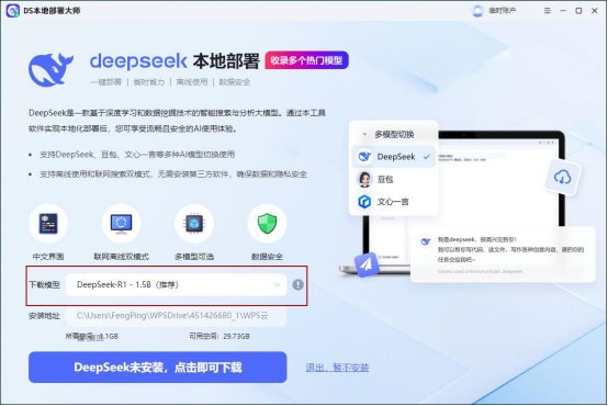 点击模型下方的【点击即可下载】按钮,软件便会自动开始工作。它会在后台自动完成deepseek模型在本地环境的一系列复杂配置和安装流程。