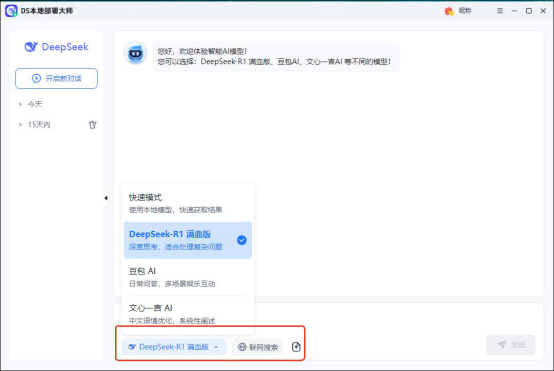 当部署完成,页面下方会显示“立即体验”按钮,点击后,直接进入到AI对话界面,软件支持切换多种智能问答模型,如deepseek满血版、豆包、文心一言等。