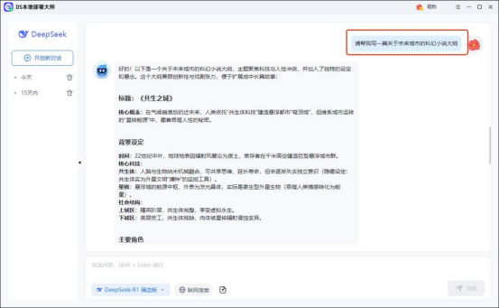 现在,可以尽情与deepseek模型展开互动,无论是提出问题、让它创作文章、进行翻译,还是其他文本相关任务,它都能为你提供智能服务。如“请帮我写一篇关于未来城市的科幻小说大纲”,稍等片刻,模型就能给出条理清晰、创意十足的大纲内容。