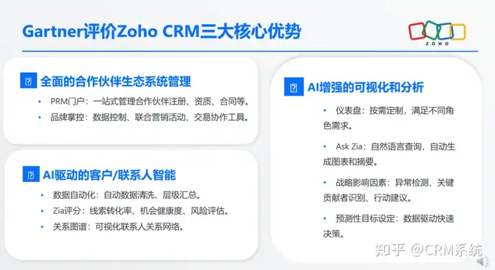 早在生成式AI爆发的8年前,2017年的Zoho就推出了AI助手Zia,AI被开始广泛应用于CRM产品中的售前、售中、售后等等环节,其可以帮助企业进行智能化推荐和数据分析,提高企业对于客户数据的管理和更有价值利用。