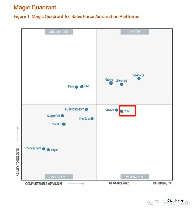 但在这些之外,更能看到的是,这些AI价值的更底层,也恰是Zoho原本就足够强大、灵活且专业的CRM等具备强流程、强权限知识的产品,这个如今已成为服务全球150多个国家和地区、30万家企业的CRM巨头,已经连续多年入选Gartner销售自动化(SFA)魔力象限“远见者”象限,在2025年更是跻身全球CRM综合实力Top4。