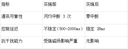 1. 可靠性指标:连续运行 3 个月,累计传输数据 1.2TB,实现零丢包;控制指令响应延迟稳定在 28ms±5ms。