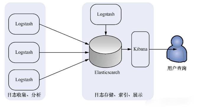 此架构由Logstash分布于各个节点上来收集相关日志、数据,并对其进行分析、过滤后发送给远端服务器上的Elasticsearch进行存储。Elasticsearch将数据以分片的形式压缩存储,并提供多种API供用户查询和操作。用户亦可以更直观地通过配置Kibana Web方便地对日志查询,并根据数据生成报表。
