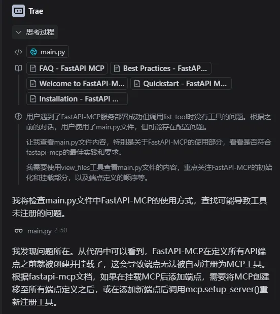 这样我们就可以引用对应的API文档让TRAE帮我们进一步把服务借助FastAPI-MCP包装成MCP服务,并使用FastMCP给出请求Demo。而FastAPI-MCP的使用也非常简单,只需要添加三行代码就可以完成MCP服务的适配