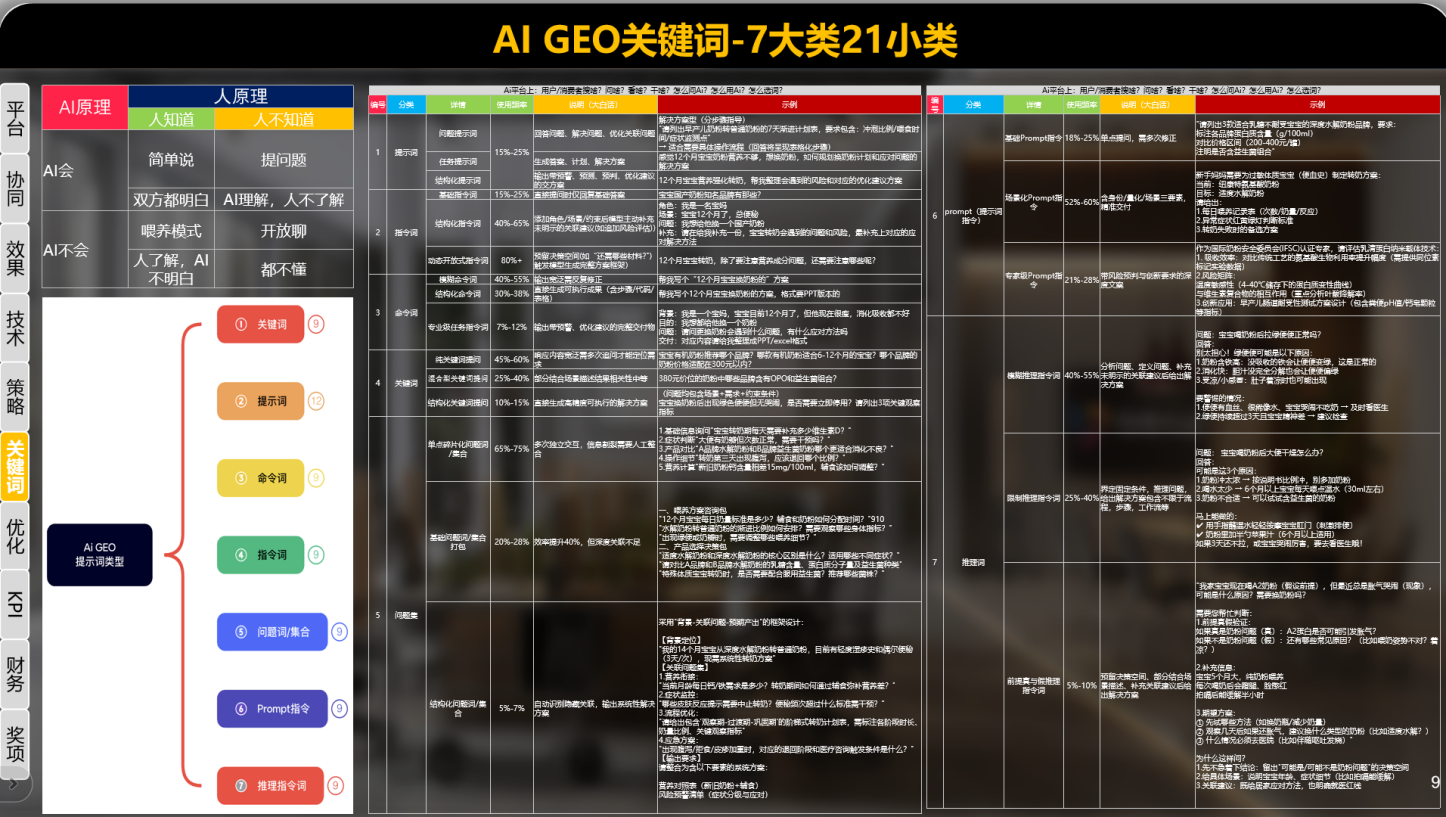 问题提示词 | 15%-25% | 回答问题、解决问题、优化关联问题 | 解决方案型(分步骤指导)"请列出早产儿奶粉转普通奶粉的7天渐进计划表,要求包含:冲泡比例/喂食时间/症状监测点"→ 适合需要具体操作流程(回答将呈现表格化步骤) |