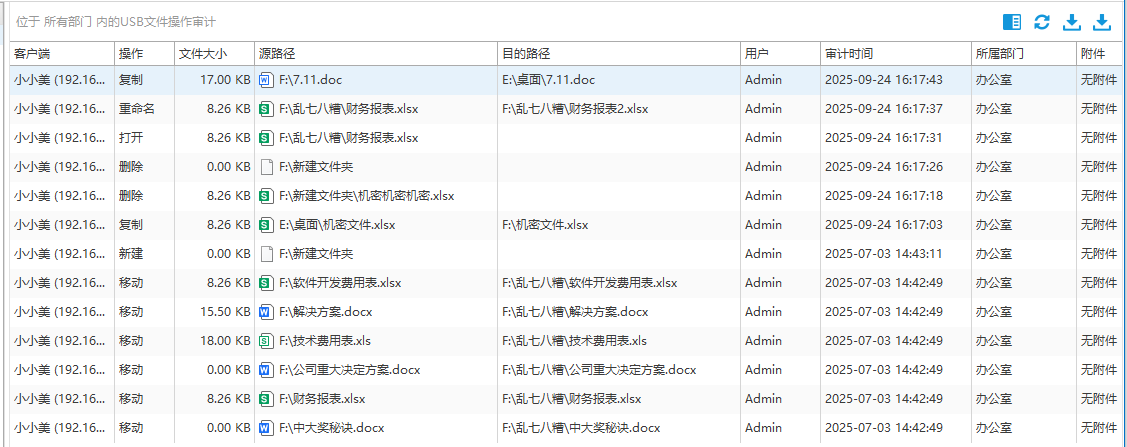 软件不仅能识别U盘的接入行为,还能实时监控并记录U盘内文件的具体操作,包括文件的复制、粘贴、删除、重命名及新建等动作。系统会详细留存操作时间、文件路径、文件名及操作用户,确保每一次数据流转都可追溯,大幅提升企业对敏感信息外泄的防控能力。
