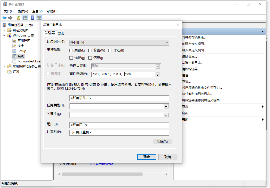 在右侧点击“筛选当前日志”,在“事件ID”栏输入 2003、20001、20003、7000(这些ID与USB设备识别相关),点击确定。