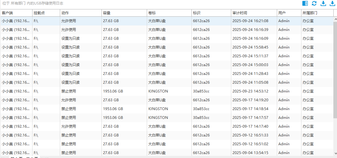 软件可全面记录员工电脑上所有U盘的插拔行为,包括插拔时间、U盘卷标、U盘标识、U盘容量、在哪台电脑上插入的,U盘的权限等详细信息。该功能帮助企业精准掌握USB存储设备的使用情况,有效防范因随意使用U盘导致的数据泄露或病毒入侵风险,为终端安全管理提供可靠依据。