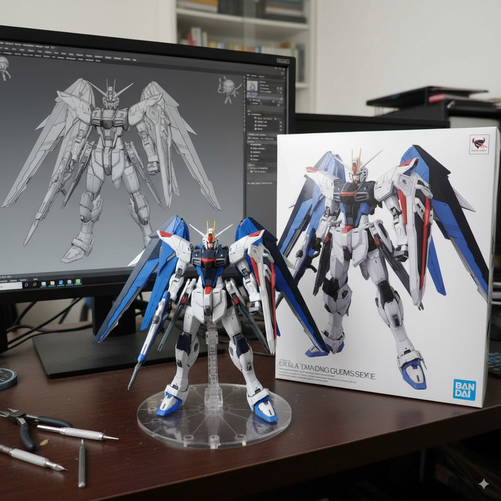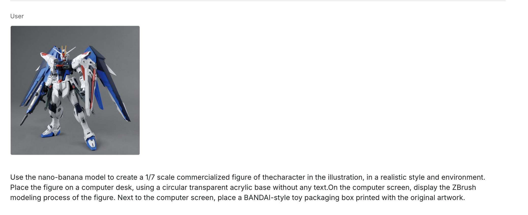 中文含义:使用nano-banana模型制作一个1/7比例的实体模型,风格和环境保持写实。将模型摆放在电脑桌上,底座为圆形透明亚克力材质,且不带任何文字。电脑屏幕上显示的是该模型在ZBrush中的建模过程。在电脑屏幕旁边,放置一个TAMIYA风格的玩具包装盒,包装盒上印有原始插画。