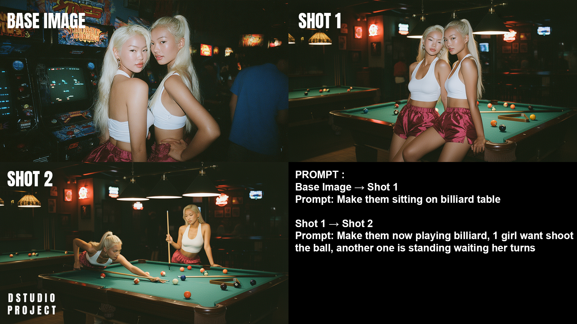 Base Image → Shot 1: Make them sitting on the billiard table.