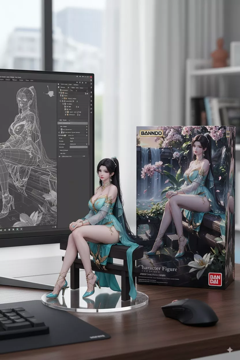 Use the nano-banana model to create a 1/7 scale commercialized figure of thecharacter in the illustration, in a realistic style and environment. Place the figure on a computer desk, using a circular transparent acrylic base without any text.On the computer screen, display the ZBrush modeling process of the figure. Next to the computer screen, place a BANDAI-style toy packaging box printed with the original artwork.