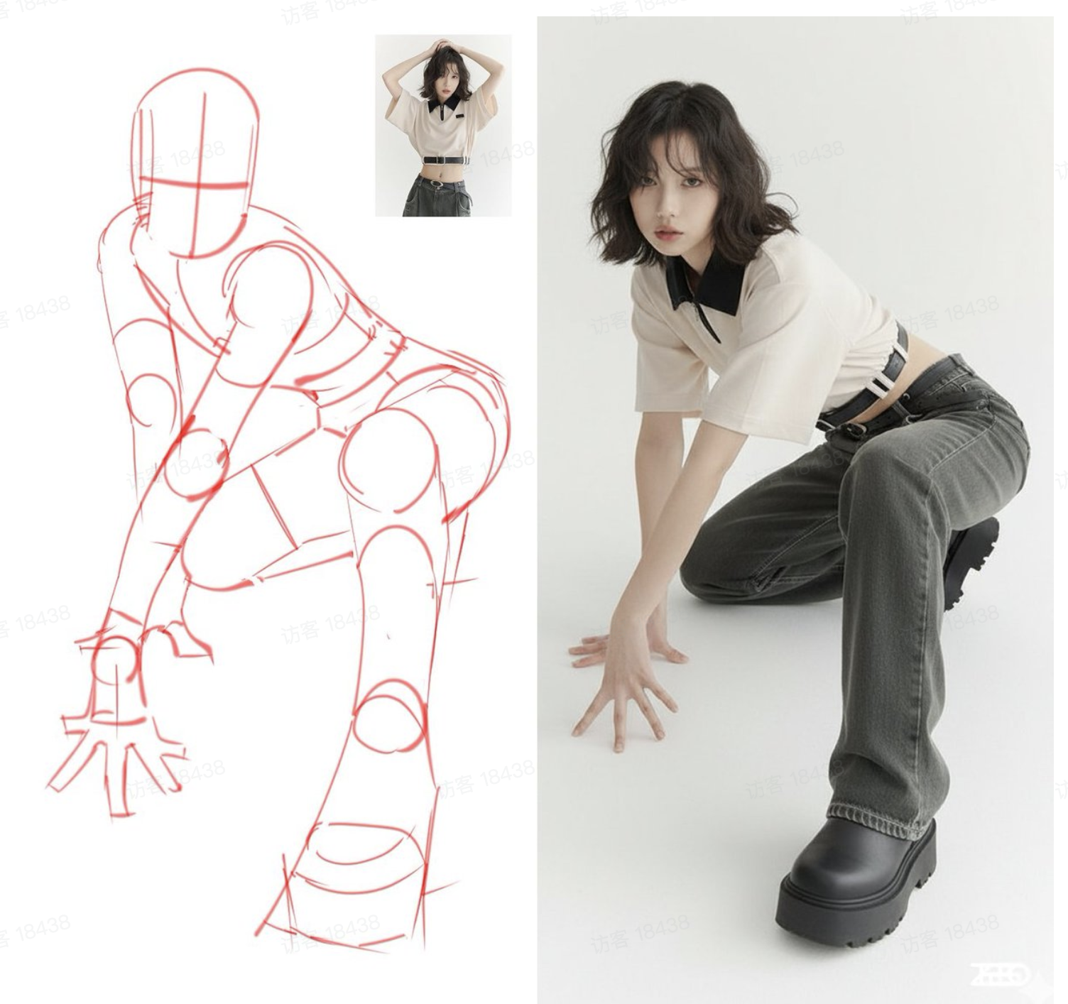 将图 1 中的角色替换为图 2 中的姿势,在专业摄影工作室拍摄