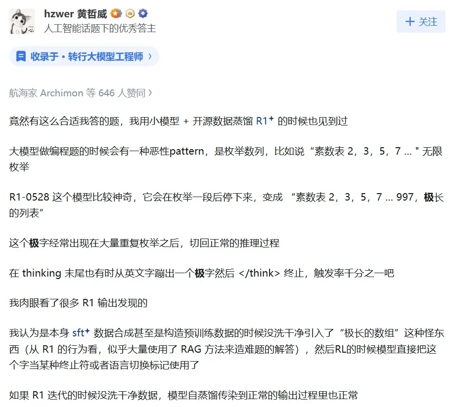 因此问题可能出在数据清洗不够彻底。之前的V3.1版本做SFT(监督微调)数据合成,在构建预训练数据时,可能没有删除掉一组叫"'极长'的数组"的脏数据。