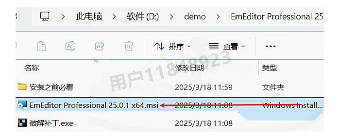 在解压出来的文件夹中,找到并双击"EmEditorProfessional 25.0.1x64.msi"文件开始安装过程。系统可能会弹出安全提示,点击"是"继续即可。