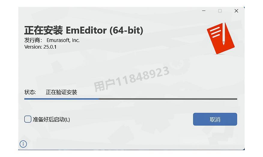 此时系统正在安装EmEditor,这个过程可能需要几分钟时间,请耐心等待(取决于你的电脑配置)。