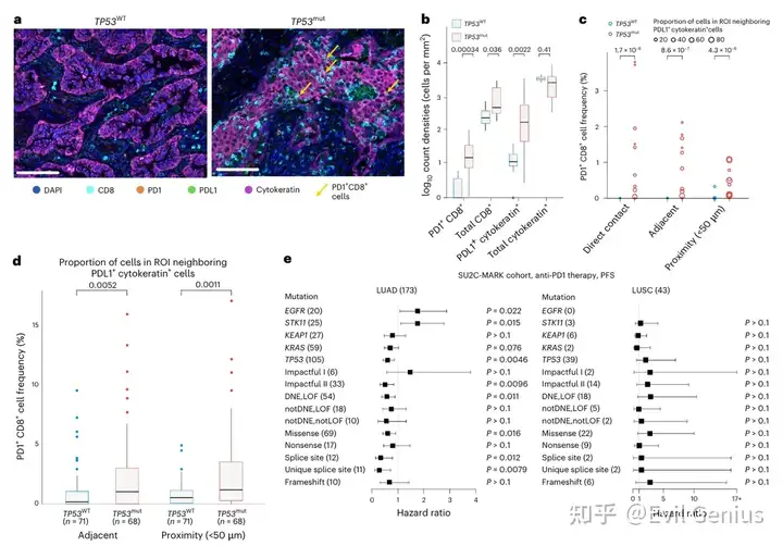 :多重免疫荧光在多个独立队列中证实,TP53mut肿瘤内有更多的PD-L1+肿瘤细胞和PD-1+CD8+ T细胞,并且两者之间的空间共定位更强。