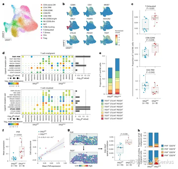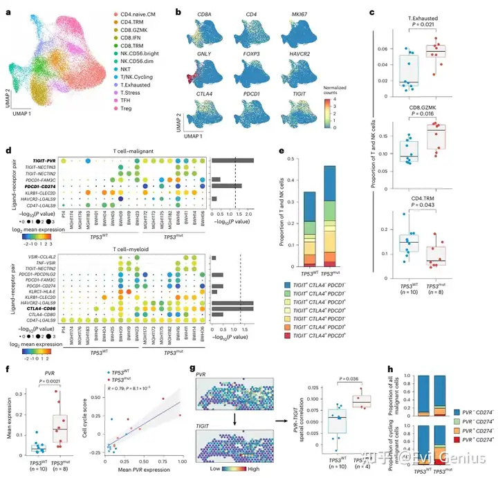 :TIGIT 和其配体 PVR 在TP53mut肿瘤组织中的空间共定位程度更高。PVR在增殖中的恶性细胞上表达尤其高。