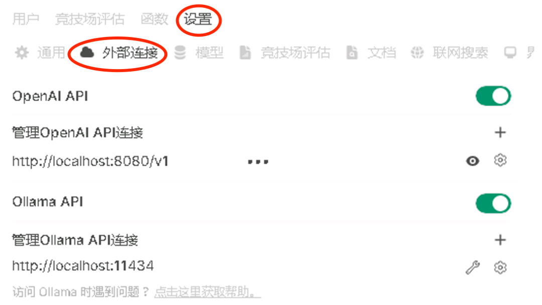 点击设置 - 外部链接,照着抄一下,api key 随便填写