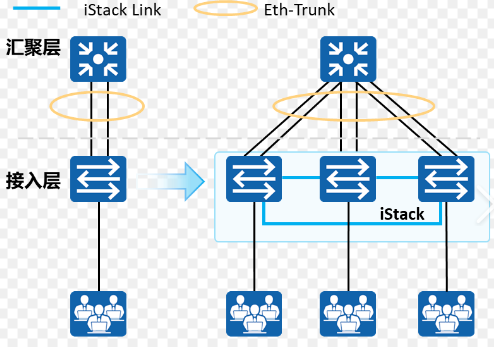 设备冗余 | 堆叠 (iStack/IRF) | 多设备虚拟化为一台逻辑设备 | 简化管理,设备级1:N备份,跨设备链路聚合 | 网络核心层 |