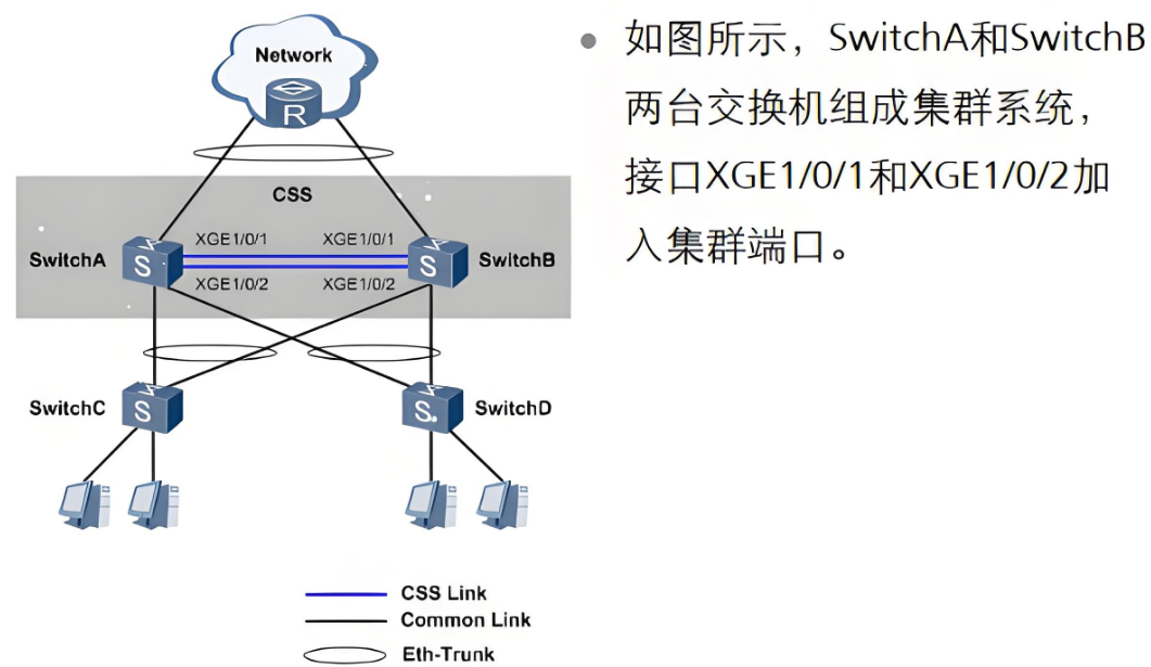 主要面向高端框式交换机,通过专用的集群卡或线缆将两台交换机连接成一个逻辑实体,提供更高的带宽和可靠性,其概念与堆叠类似,但通常用于核心层大型设备。