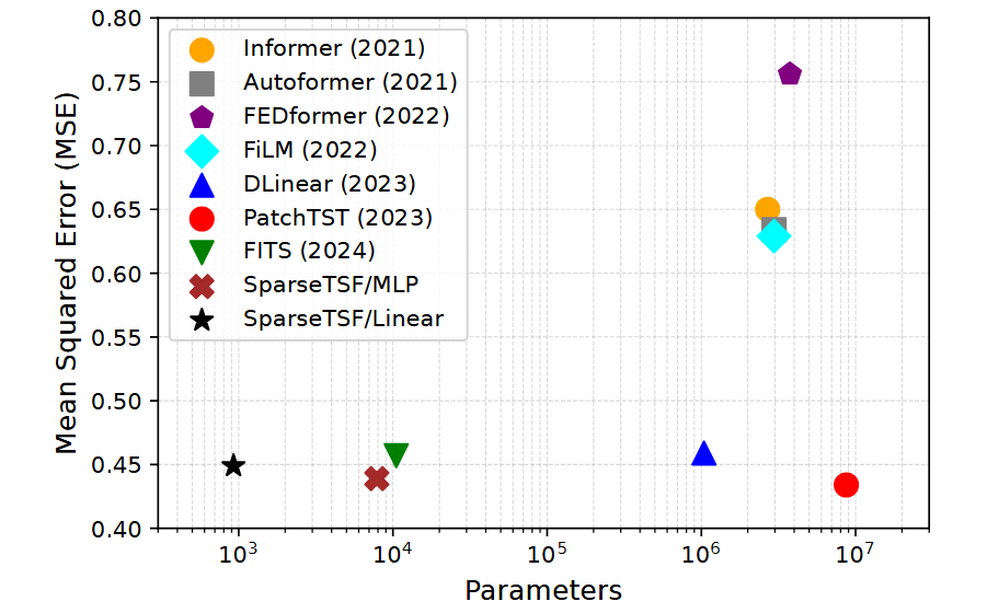 说明 SparseTSF 的参数规模远低于最简单的标准线性模型,充分体现了其极轻量化特性。