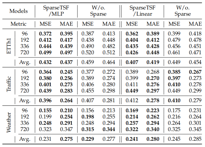 因此,稀疏技术通过强化周期特征提取,进一步提升了LTSF任务的预测性能。