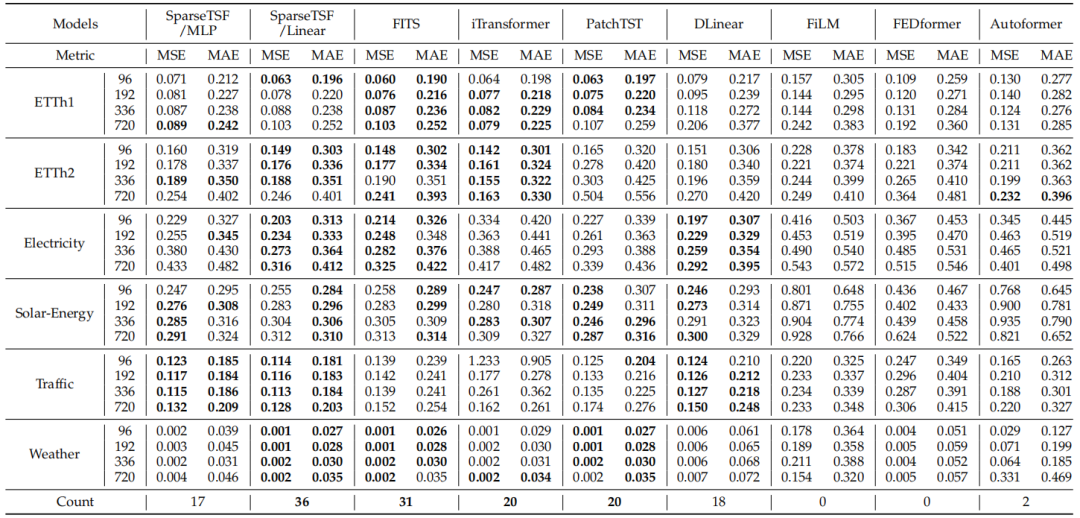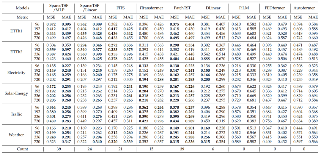 表2. SparseTSF与其他主流模型在多变量长时序预测任务中的结果对比