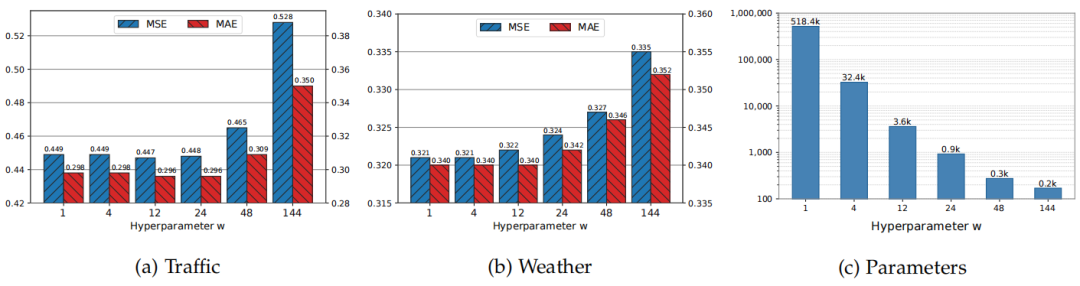 我们在三个不同数据集上进行了消融实验:(i)ETTh1:按小时采样、具有日周期;(ii)Traffic:按小时采样,具有日周期与周周期;(iii)Weather:按10分钟采样、具有日周期。对于前两个数据集,超参数 设置为日周期长度,即 。但对于Weather数据集,其日周期为144,若直接设为144则会导致过短的降采样序列,信息利用不足,因此设置为 。关于 的选择标准将在后续进一步讨论。
