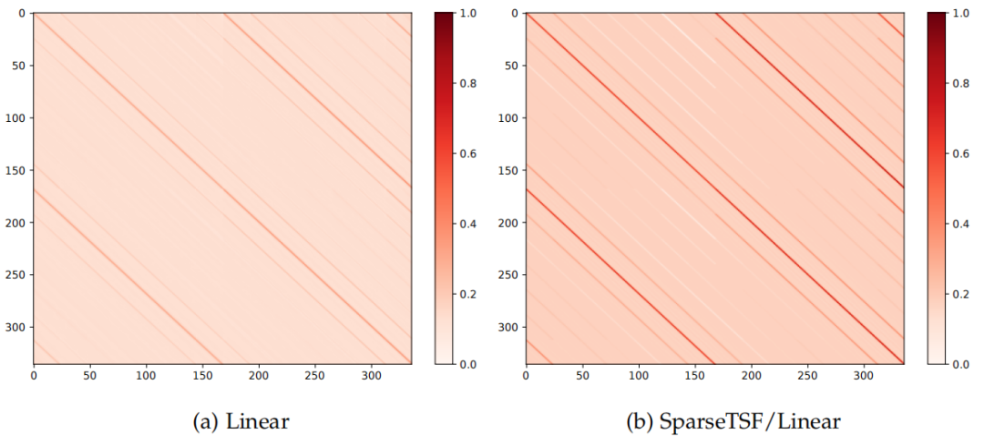 在理论分析部分,我们揭示了稀疏技术为何能提升预测性能,即其引入了结构正则化的机制。本节进一步从表示学习角度进行验证。图6可视化了Linear模型与SparseTSF/Linear在Traffic数据集上的归一化权重分布。结果显示: