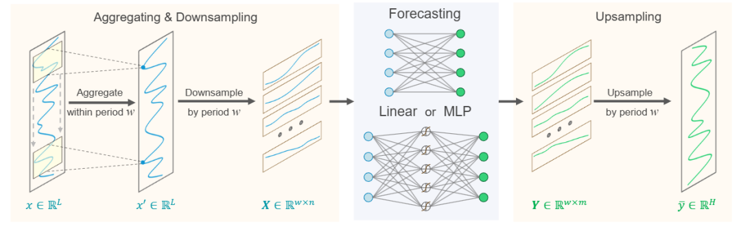 假设时间序列 的周期为 ,我们首先将原始序列按周期进行降采样,得到 个子序列,每个子序列长度为 。接着,利用参数共享的骨干模型分别对这些子序列进行预测,预测结果再上采样回长度为 的完整序列。